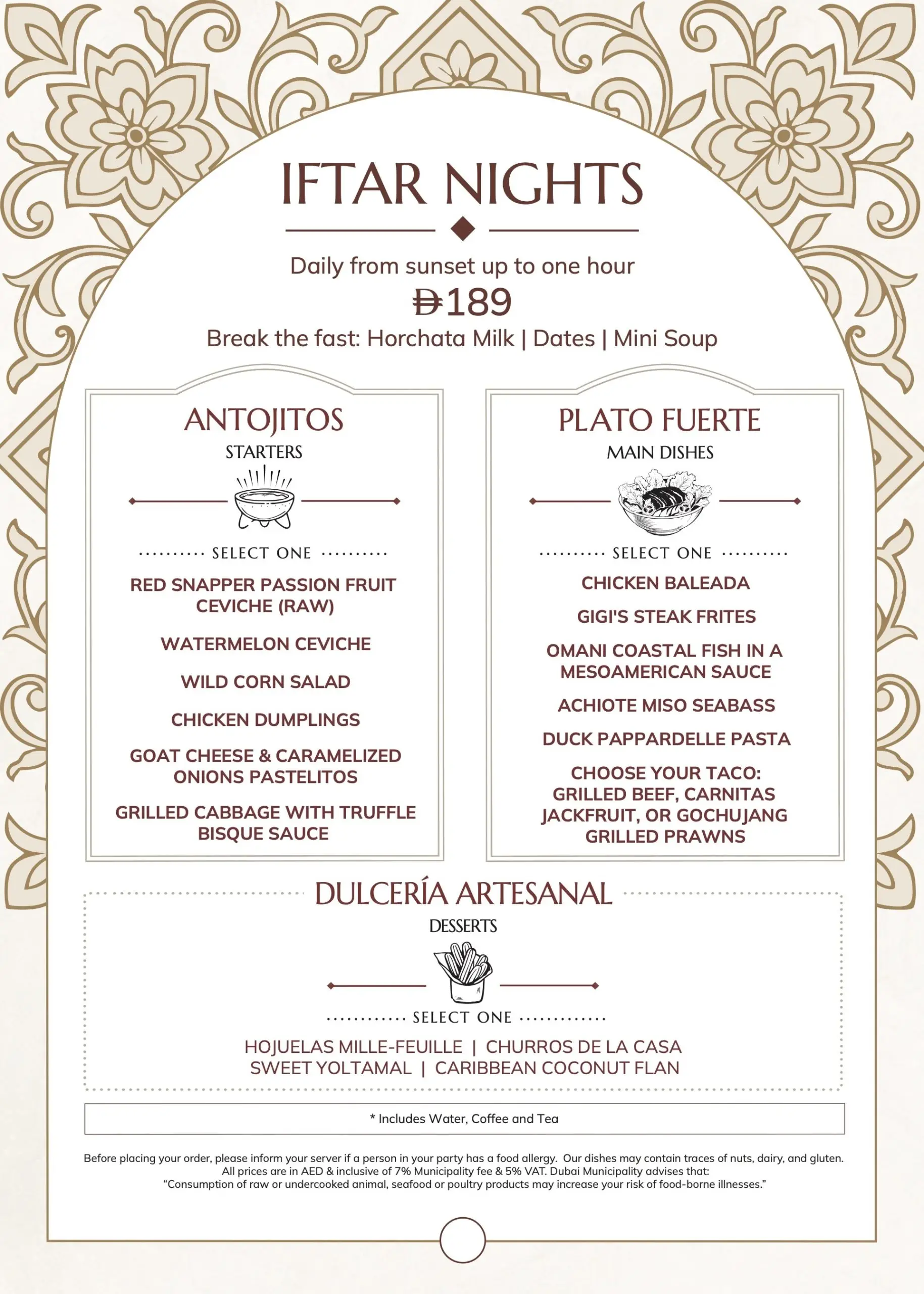 At AED 189 per person, this special Iftar menu is available daily beginning at sunset and offered for one hour thereafter.