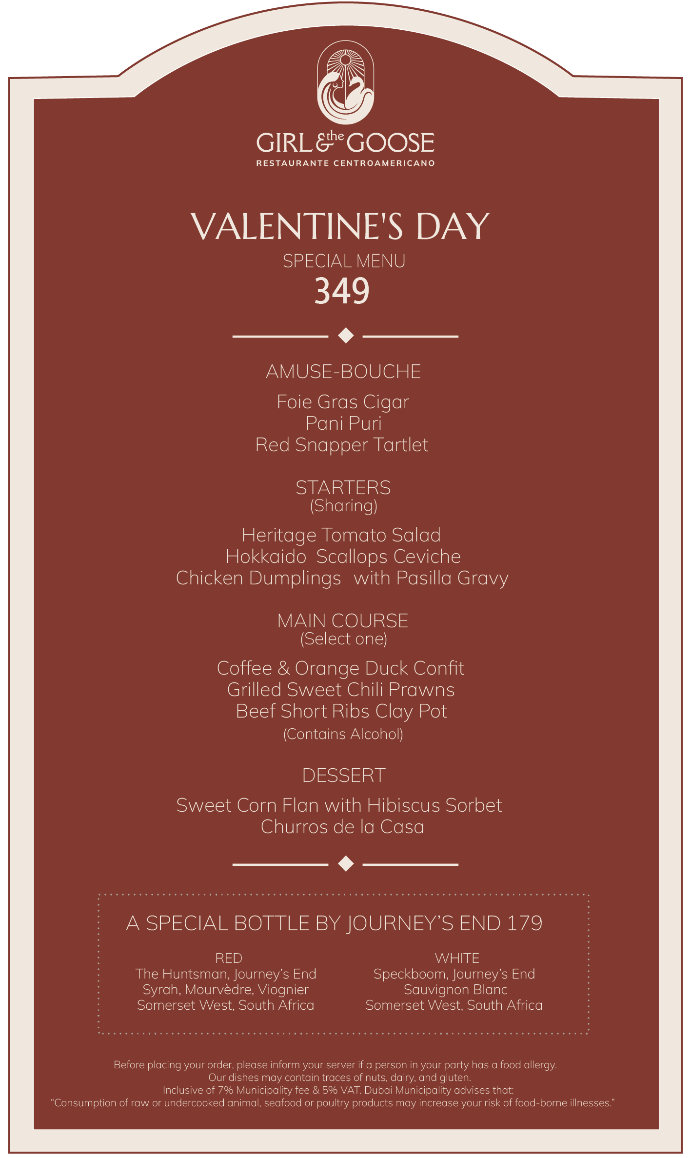 Enjoy a special menu with a curated selection of amouse bouche, our signature starters, mains and a special Valentine themed dessert to end the night. 349 per person, with the option to add a bottle of Journey’s End (red or white) for 179.